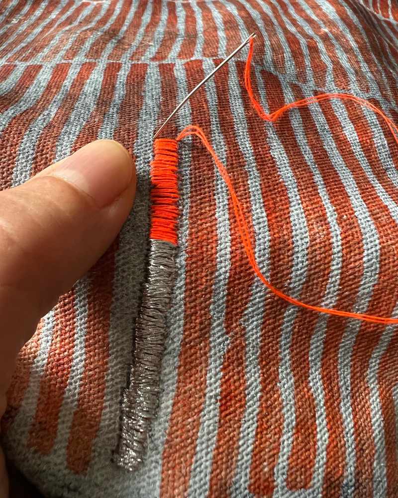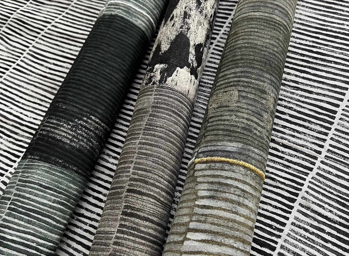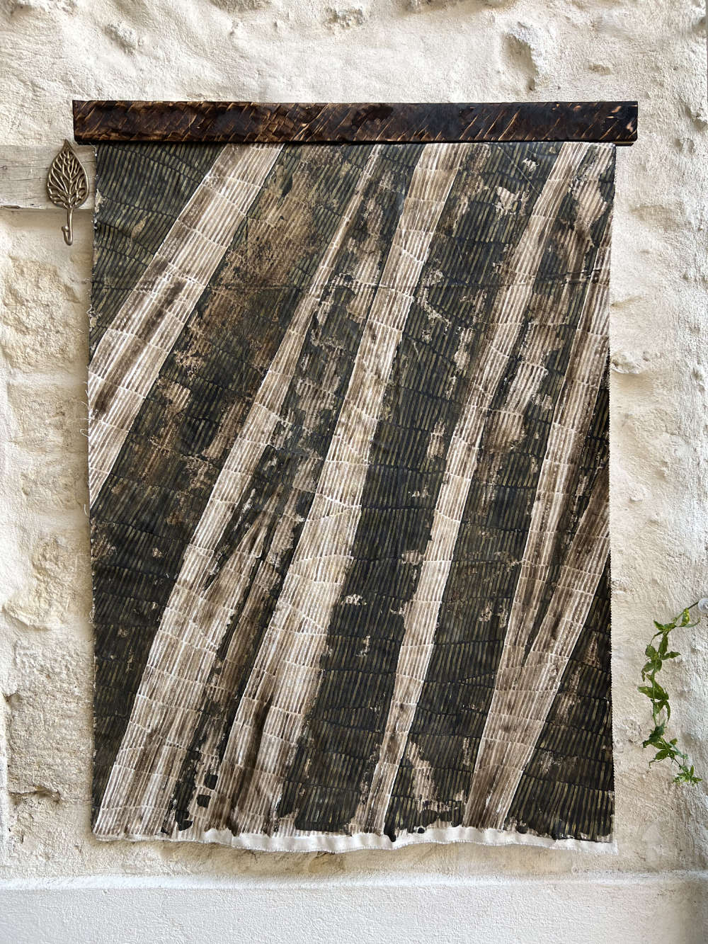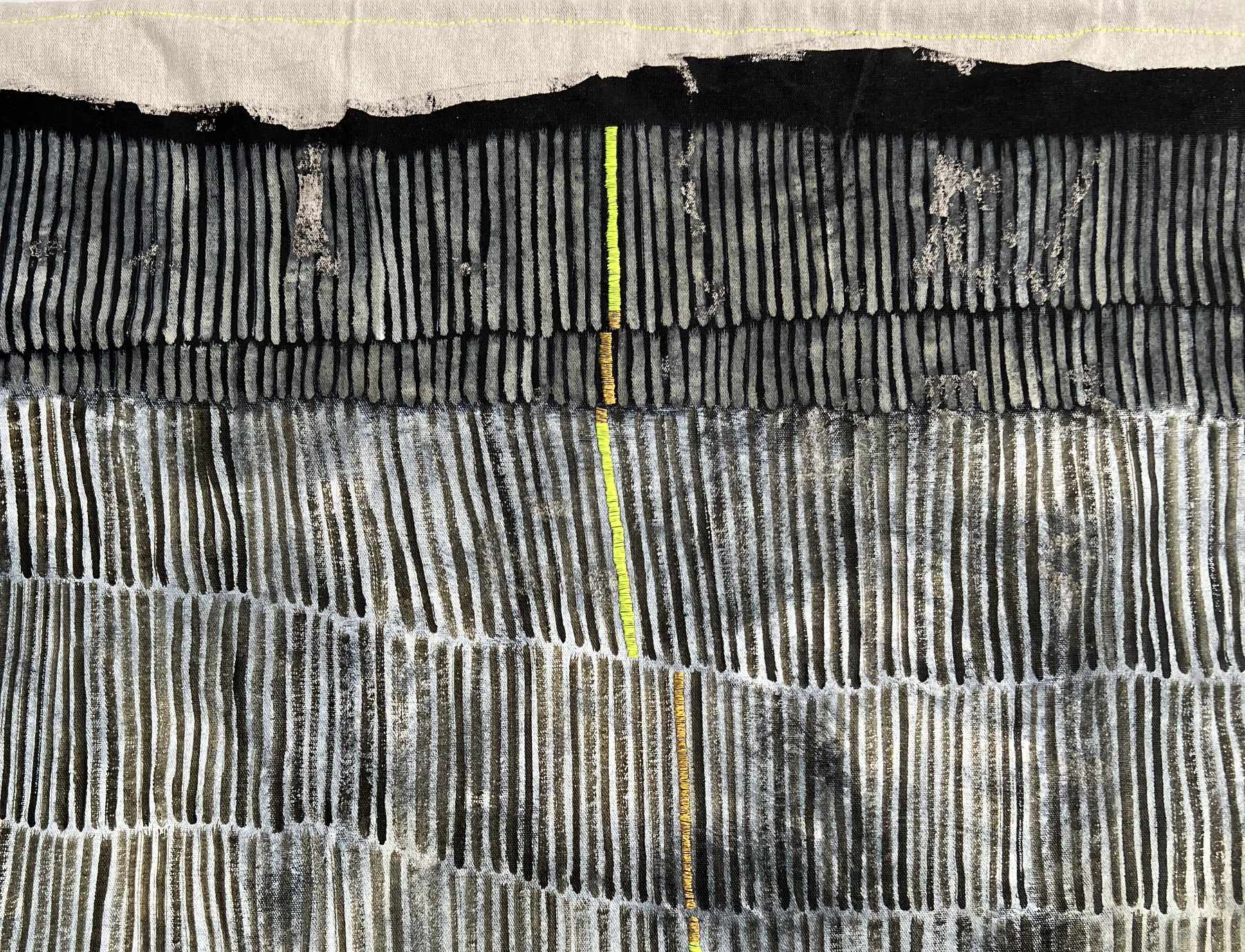 Toiles libresSur une toile libre en coton préparée au gesso blanc ou noir, viennent rebondir des motifs au pinceau à l’huile ou à la craie, agrémentés par zones ou lignes verticales de broderies à la main.